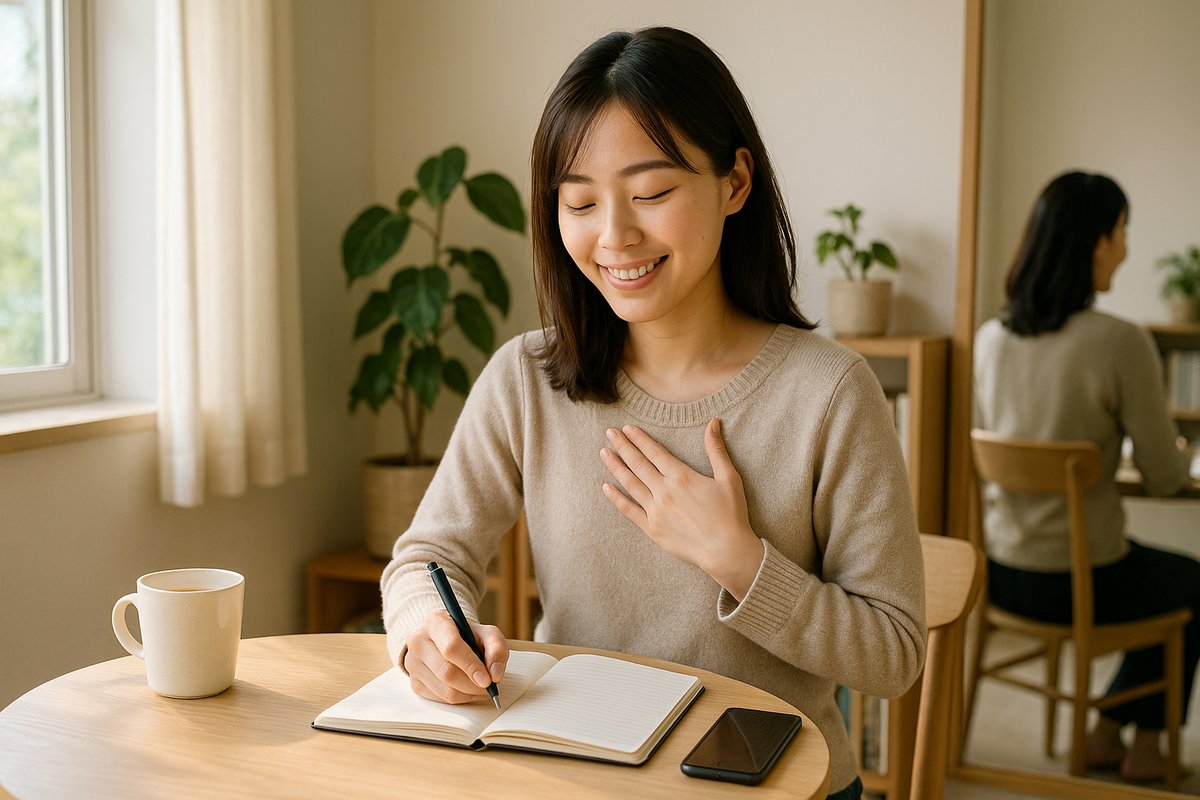 自己肯定感アップの第一歩は「今の自分をそのまま受け入れること(自己受容)」です。できていない部分があっても、「まあ、これも自分」と捉えてみましょう。セルフコンパッション(自分へのやさしさ)は、その基礎となります。